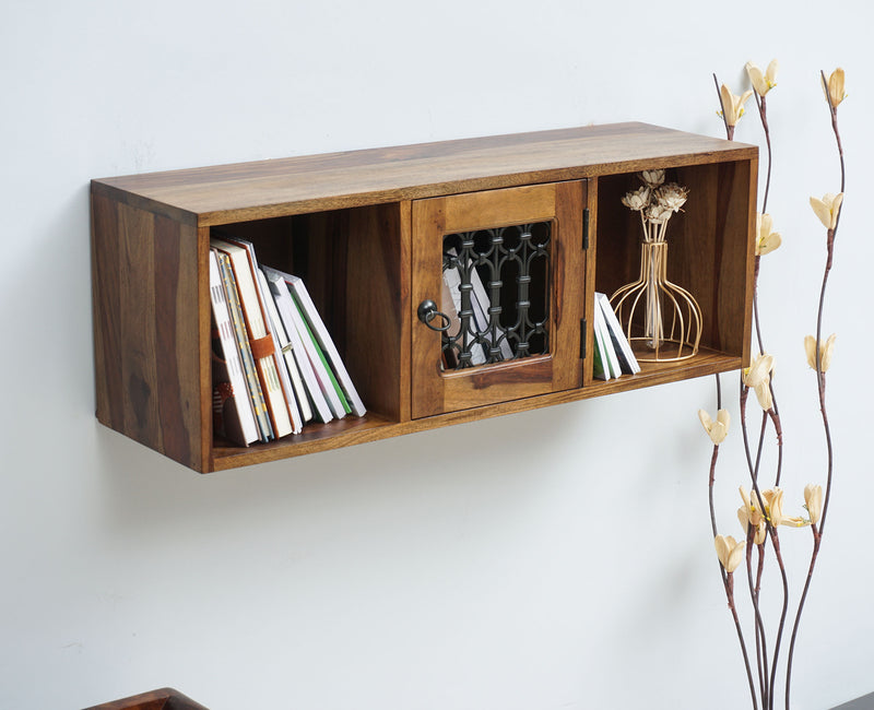Sweden Wooden Wall Shelve One Door is a perfect solid wood . Use of Sheesham Wood as primary material gives this a solid & sturdy look. Secondary material is used as Powder Coated Metal Jali , MDF is used in the Backside. We offer free country-wide shipping and free installation service. The wood used in the furniture is perfectly seasoned for optimum moisture content, to reduce the possibility of seasonal expansion or contraction of the products.
