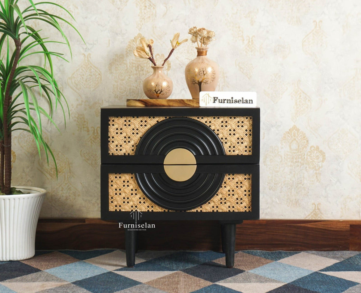 The Regal Solid Wood Rattan Bedside Table Two Drawer - (Black Finish)