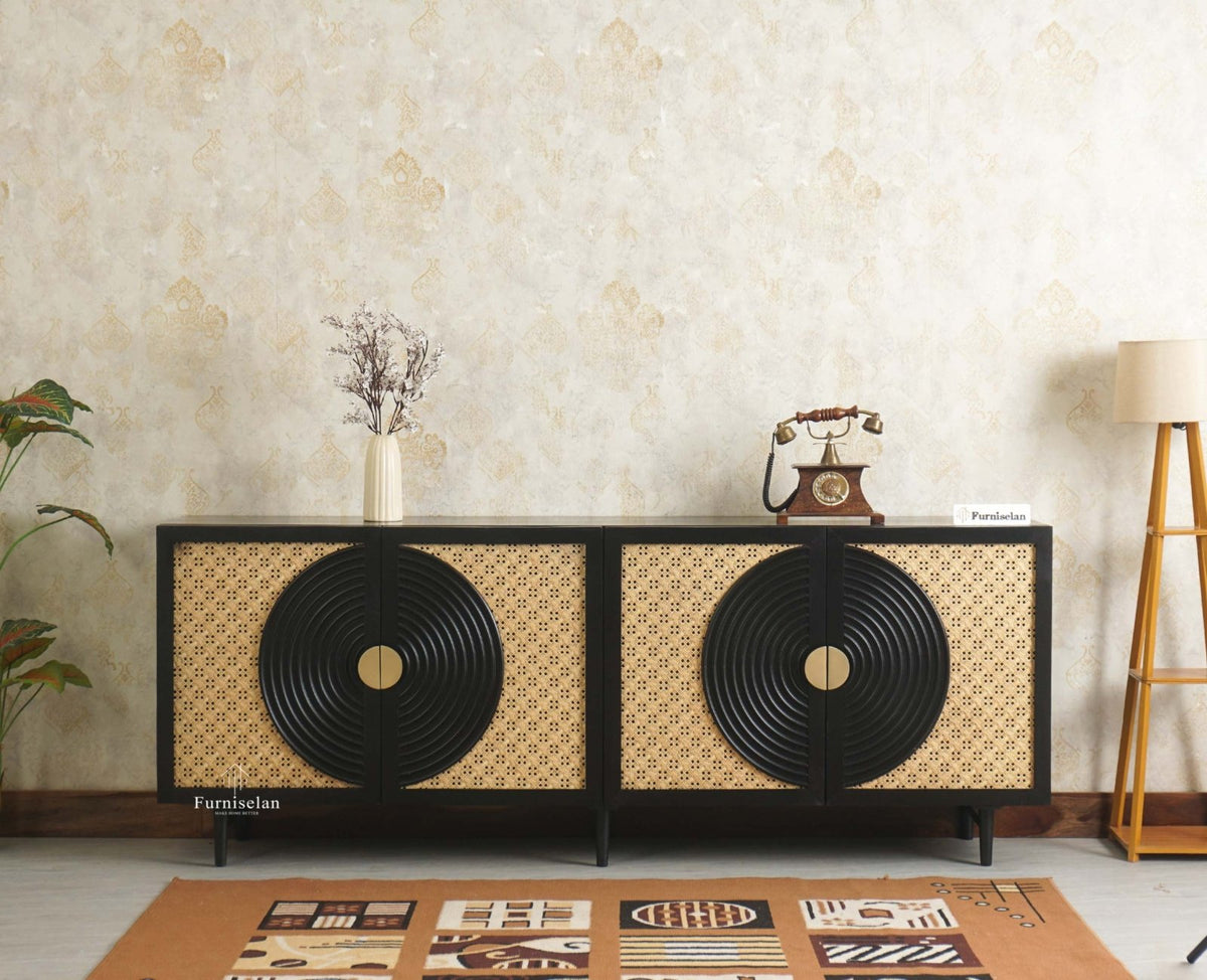 The Regal Solid Wood Rattan Large Sideboard Cabinet Four Doors - (Black Finish)
