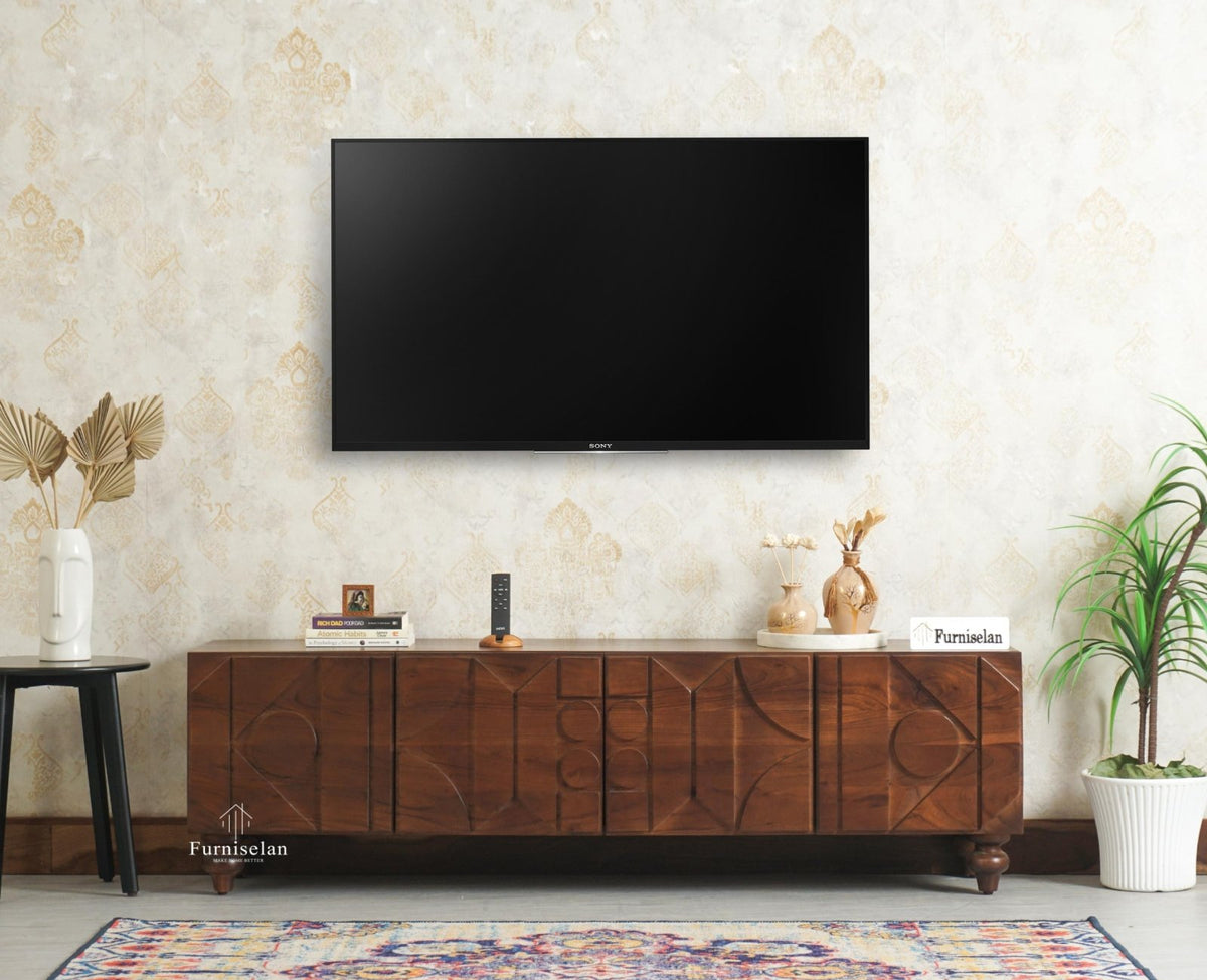 Wilson Solid Wood Four Doors TV Cabinet is a perfect solid wood Tv Cabinet. Use of Acacia Wood as primary material gives this Tv Cabinet a solid & sturdy look. Secondary material is used as MDF is used on the Back side of the product. We offer free country-wide shipping and free installation service. The wood used in the furniture is perfectly seasoned for optimum moisture content, to reduce the possibility of seasonal expansion or contraction of the products.